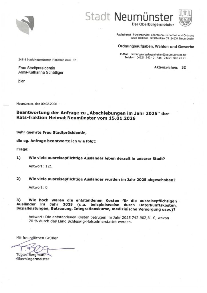 Anfragen unserer Fraktion ergaben, daß in den vergangenen Jahren ausreisepflichtige Ausländer in Neumünster entgegen geltendem Recht einfach nicht abgeschoben werden. Während im Jahr 2023 immerhin 1 (!!) ausreisepflichtiger Ausländer zurück in die Heimat geschickt wurde, glänzte die Stadtverwaltung unter der Führung von Oberbürgermeister Bergmann in den vergangenen beiden Jahren mit Untätigkeit. Kein einziger Ausreisepflichtiger wurde abgeschoben!