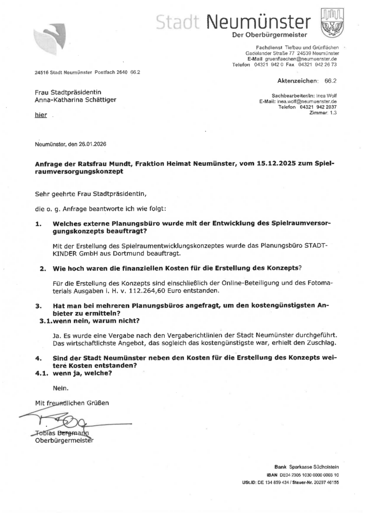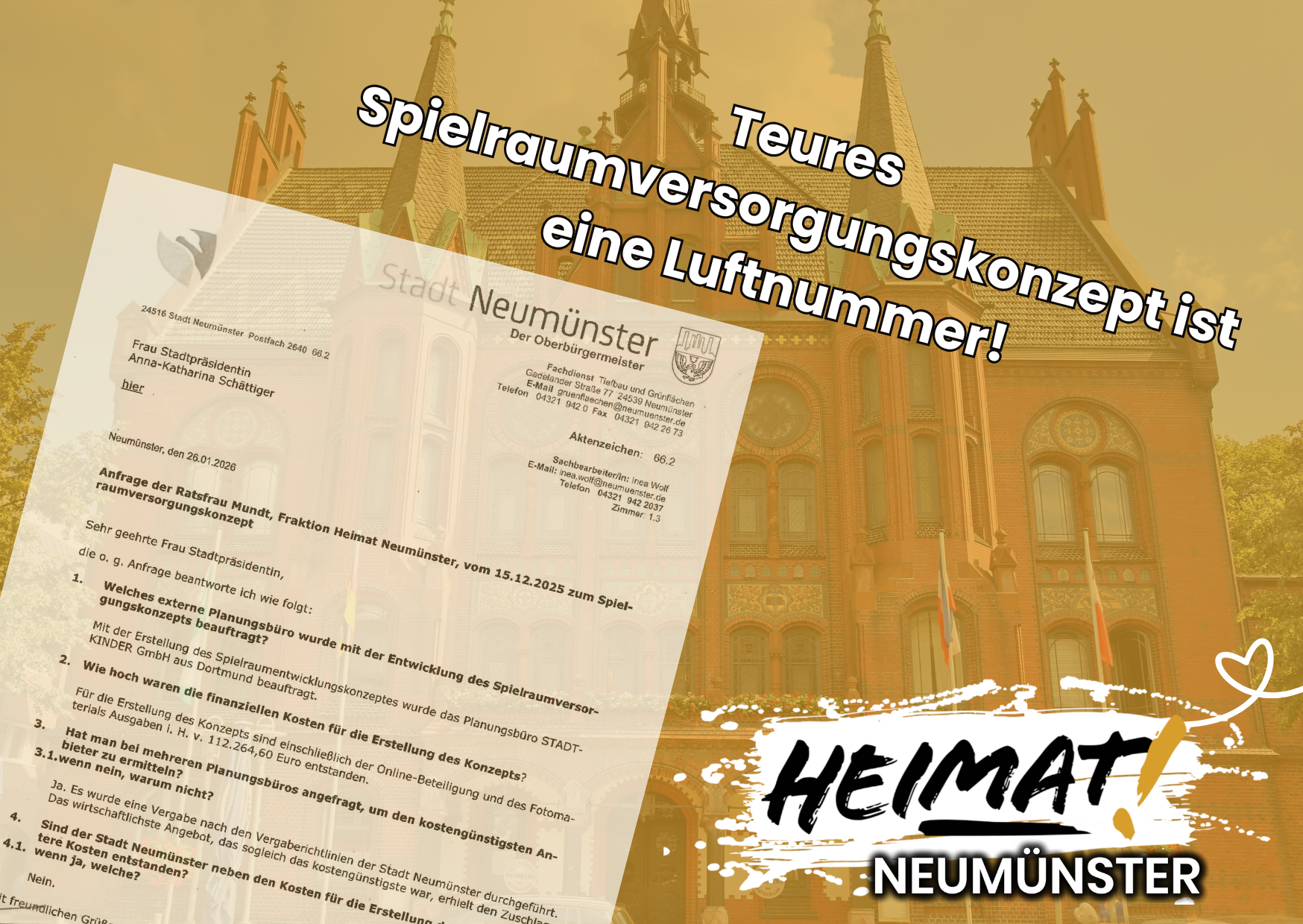 Warum kann die zuständige Abteilung der Stadt nicht eine dafür geeignete Liste zum Abhaken bestimmter, wichtiger Informationen über Spielplätze und deren Zustand selbst erstellen, ausdrucken und zwei motivierte Mitarbeiter für 3 Wochen quasi in den Außendienst schicken? Es ist für uns absolut unverständlich, weshalb man wiederholt mit Steuergeldern so verschwenderisch umgeht — aber scheinbar ist das in Neumünster mittlerweile üblich, denn das erinnert uns stark an andere „Geldsünden“, wie z.B. die Sache mit dem Umzug der Stadtbücherei. Und wieder betrifft dies einen Sektor, für den Stadtbaurätin Kling verantwortlich ist.